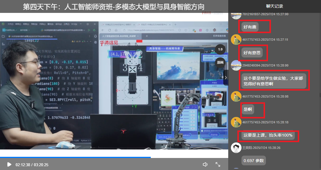 本次暑期师资班聚焦“多模态大模型+具身智能”这一AI前沿技术方向,并依托华清远见元宇宙实验中心人工智能虚拟仿真平台全新升级的“具身智能机械臂”3D场景化项目教学系统,为教师们带来了全新的跨模态教学实践体验。培训反馈热烈,体系化的实战课程及高效直观的教学方式,获得了全国众多高校老师的高度认可与广泛好评。