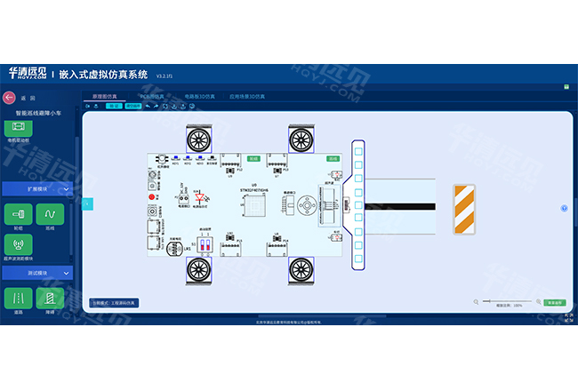 · 基础场景实训:2D 模式下完成红外循迹赛车系统搭建 —— 配置红外传感器、电机驱动模块与 STM32 控制核心参数,设定 “信号采集→方向判断→电机控制” 逻辑;切换至 3D 虚拟赛道场景,查看赛车循迹运行效果,解析控制指令交互逻辑;