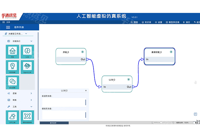 · 基础场景实训:2D 模式下完成专属聊天助手搭建 —— 拖拽组件编排 “用户提问→意图识别→知识检索→LLM 回复” 工作流,配置知识库(如 “课程咨询” 专属文档);切换至 3D 智能对话场景,模拟学生咨询课程的对话场景,查看参数调整对回复质量的影响,解析对话指令交互逻辑;