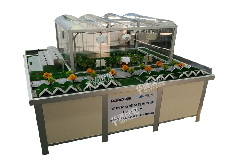 智能农业综合实训系统(FS_ZNNY)主体是一个铝合金金属骨架和有机玻璃墙壁组成的温室系统,与其他感知、控制及执行系统一起,构成完整的温室大棚系统。包括:透明温室大棚、自动遮阳罩、水泵及喷头、仿真植物和真实植物、水循环系统、通风系统、光照调节系统、温度调节系统、无线传感器网络安装位置等。是针对于物联网在农业领域自动化与智能化应用的一款实景模拟系统,依托各种传感节点(环境温湿度、土壤水分、二氧化碳、图像等),和无线通信网络实现农业生产环境的智能感知、智能预警、智能分析、专家在线指导,为农业生产提供精准化种植、可视化管理、智能化决策。为院校在物联网实训教学方面提供了一个真实的农业综合实训系统,使学生在实训中实现对物联网综合技术应用的理解并在此基础上进行创新应用,培养学生创新应用能力,充分满足了目前高校培养物联网技术人才的需求。