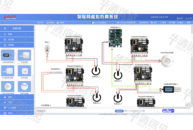 遵循“配置驱动场景”原则,要求2D场景中完成包含传感器、网关、节点的完整设备组态,方能开启3D场景,确保虚拟实验的严谨性与系统设计的完整性。