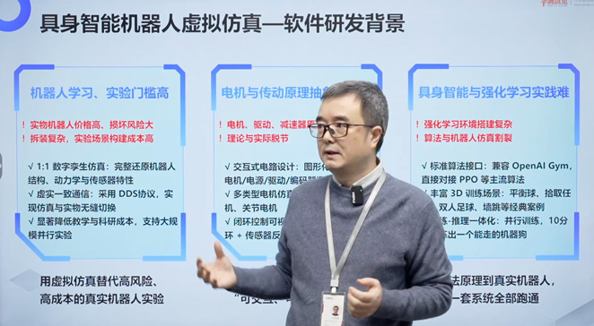 具身智能与机器人技术是华清远见重点深耕的前沿领域,元宇宙实验中心具身智能机器人虚拟仿真系统更是其响应教育政策要求,在教学工具创新上的重磅成果,代表了对具身智能机器人实践教学方式的突破性探索。本次师资班的核心创新亮点,便是全程采用这款全新推出的虚拟仿真系统,精准直击具身智能教学中【机器人学习、实验门槛高】【电机与传动原理抽象难理解】【具身智能与强化学习实践难】三大核心痛点,为高校教学提供高效解决方案。