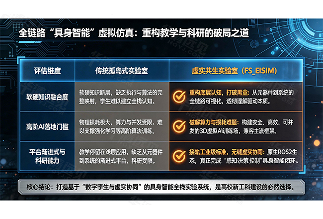 产品设计背景:传统机器人与具身智能实验室存在两大核心痛点:软硬件割裂、虚实脱节。日常教学多局限于纯算法仿真,完全缺少硬件实操环节;实体实训过度依赖真机设备,不仅设备损耗大、实操风险高,后期调试效率也极低;同时学科层面算法、机械、电控三大板块相互分离,导致学生无法建立整机系统思维,整体培养模式与工业真实研发流程严重脱节。围绕全链路贯通、虚实协同两大核心,打造一体化教学研发平台。